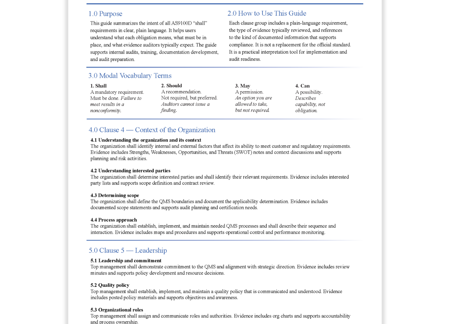 A focused reference tool designed to support internal audits, gap analysis, and management reviews by translating AS9100D requirements into clearly written, clause-level shall statements. Each clause is presented in a structured, auditor-ready format intended to reduce interpretation variability, support objective evidence identification, and improve audit planning. The guide promotes consistent application of requirements across functions … Continue reading AS9100D Shall Reference Guide